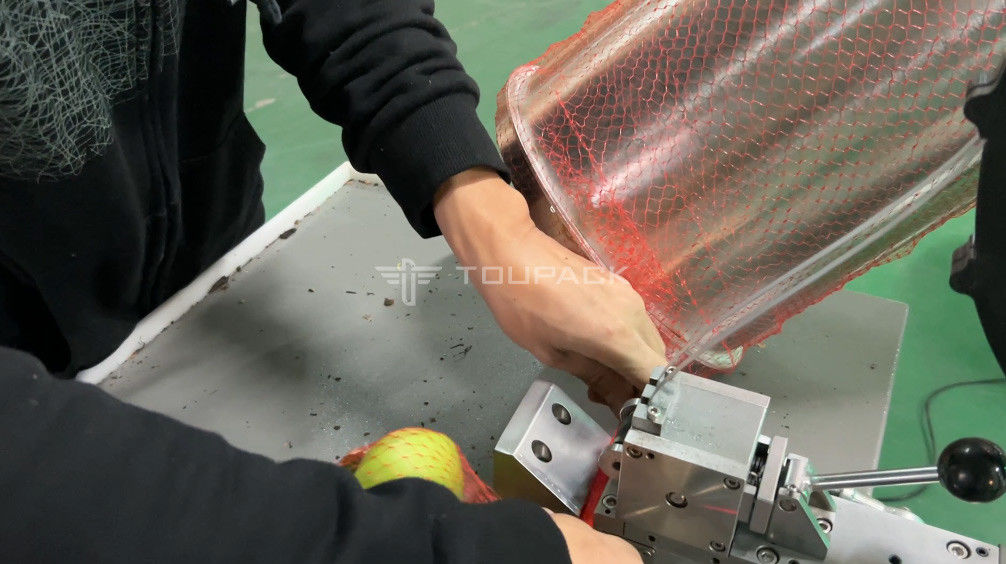 Półautomatyczna maszyna do pakowania worka sieciowego: po napełnieniu produktu w worku sieciowym maszyna jest uszczelniona, aby zapewnić bezpieczne uszczelnienie produktu w worku sieciowym.operator zdejmuje zamknięty worek z siatką i przygotowuje się do następnej rundy pakowania.